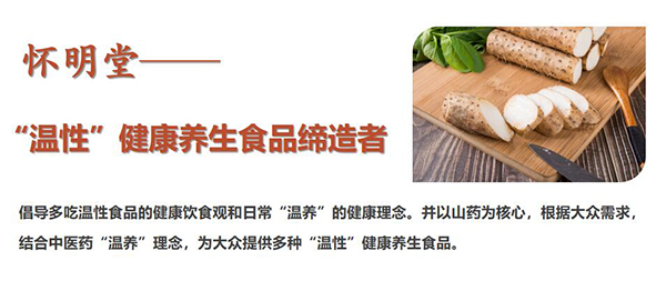 懷明堂一直倡導(dǎo)多吃溫性食品的健康飲食觀和日常“溫養(yǎng)”的健康理念,并以山藥為核心,根據(jù)大眾需求,結(jié)合中醫(yī)藥“溫養(yǎng)”理念,為大眾提供多種“溫性”健康養(yǎng)生食品。